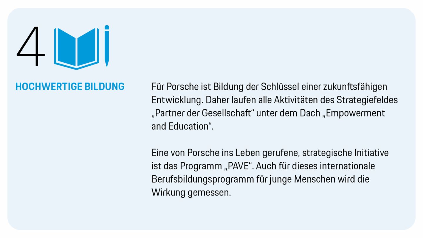 Über das Programm „Porsche Aftersales Vocational Education“ (PAVE) werden seit mehr als zehn Jahren hoch qualifizierte Mitarbeiter in technischen Berufen ausgebildet. Ihre Schulungen erfolgen an internationalen Standorten nach europäischem Standard. Anschließend werden die Mitarbeiter in weltweiten Handelsorganisationen von Porsche und weiteren Marken des Volkswagen Konzerns eingesetzt. Sowohl Auszubildende als auch der Konzern profitieren von „PAVE“: So erhalten vorwiegend benachteiligte junge Erwachsene einen Zugang zu einer fundierten und erstklassigen Ausbildung. Den Handelsorganisationen werden hoch qualifizierte Mitarbeiter zur Verfügung gestellt. Durch langfristige und strategische Schulkooperationen werden zudem Ausbildungskompetenzen lokal verankert. Somit ist „PAVE“ effektiv und nachhaltig wirksam. Gleichzeitig wird vorausschauend und flexibel auf veränderte Bedarfe bei der Berufsausbildung reagiert. Für die Absolventen des Programms werden vielversprechende Zukunftsaussichten und Entwicklungsmöglichkeiten geschaffen. Diese führen nicht nur zu mehr Selbstbestimmtheit für den Einzelnen, sondern auch zu gesellschaftlichen Verbesserungen.