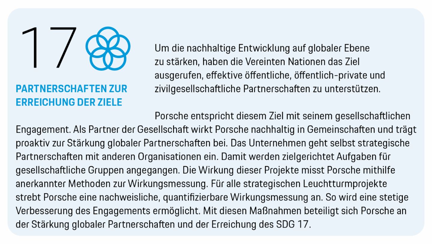 Im Berichtsjahr hat Porsche eine langfristige Wirkungsmessung für alle strategischen Leuchtturmprojekte etabliert. Das Unternehmen strebt mit seinen Aktivitäten im Strategiefeld „Partner der Gesellschaft“ hohe Reichweiten und große Effekte an. Die Erhebung der Reichweite hilft dabei, die Größenordnung unterschiedlich gelagerter Projekte besser zu verstehen. Der Sportwagenhersteller erfasst konkret, welchen Mehrwert Porsche Projekte für die Gesellschaft generieren und ob die Maßnahmen tief genug greifen konnten, um Menschen mittel- bis langfristig zu fördern.