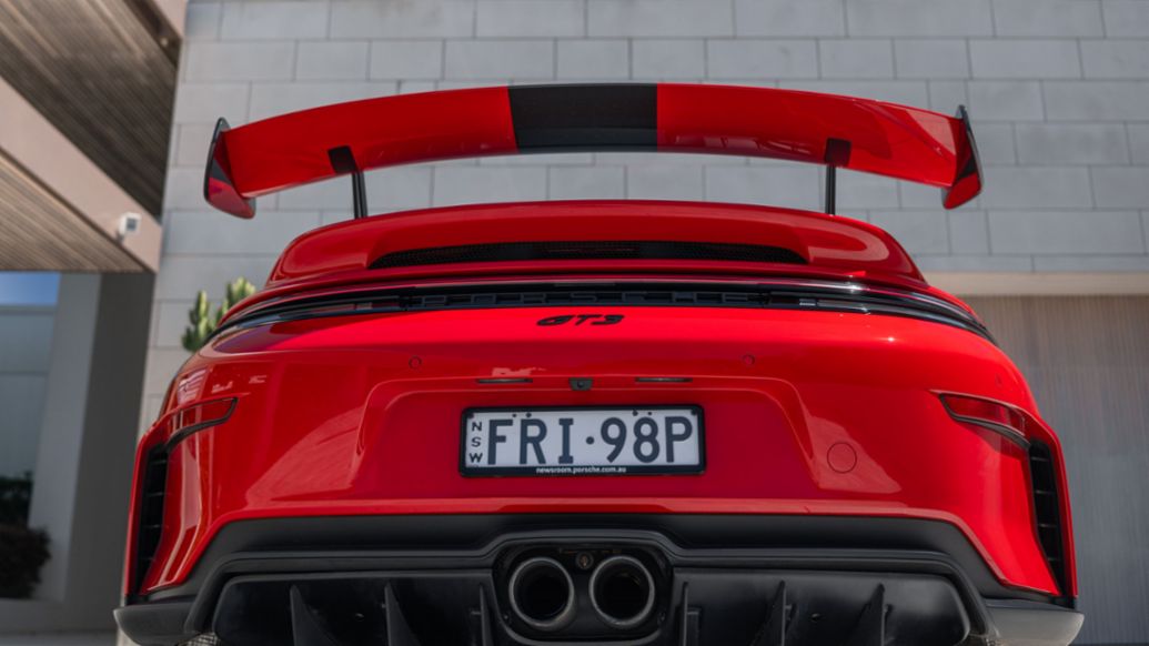 - The fixed rear wing on the 911 GT3, which uses a swan-neck design to reduce flow losses and improve downforce, features redesigned end plates that are now angled slightly outwards and also finished in the body colour.