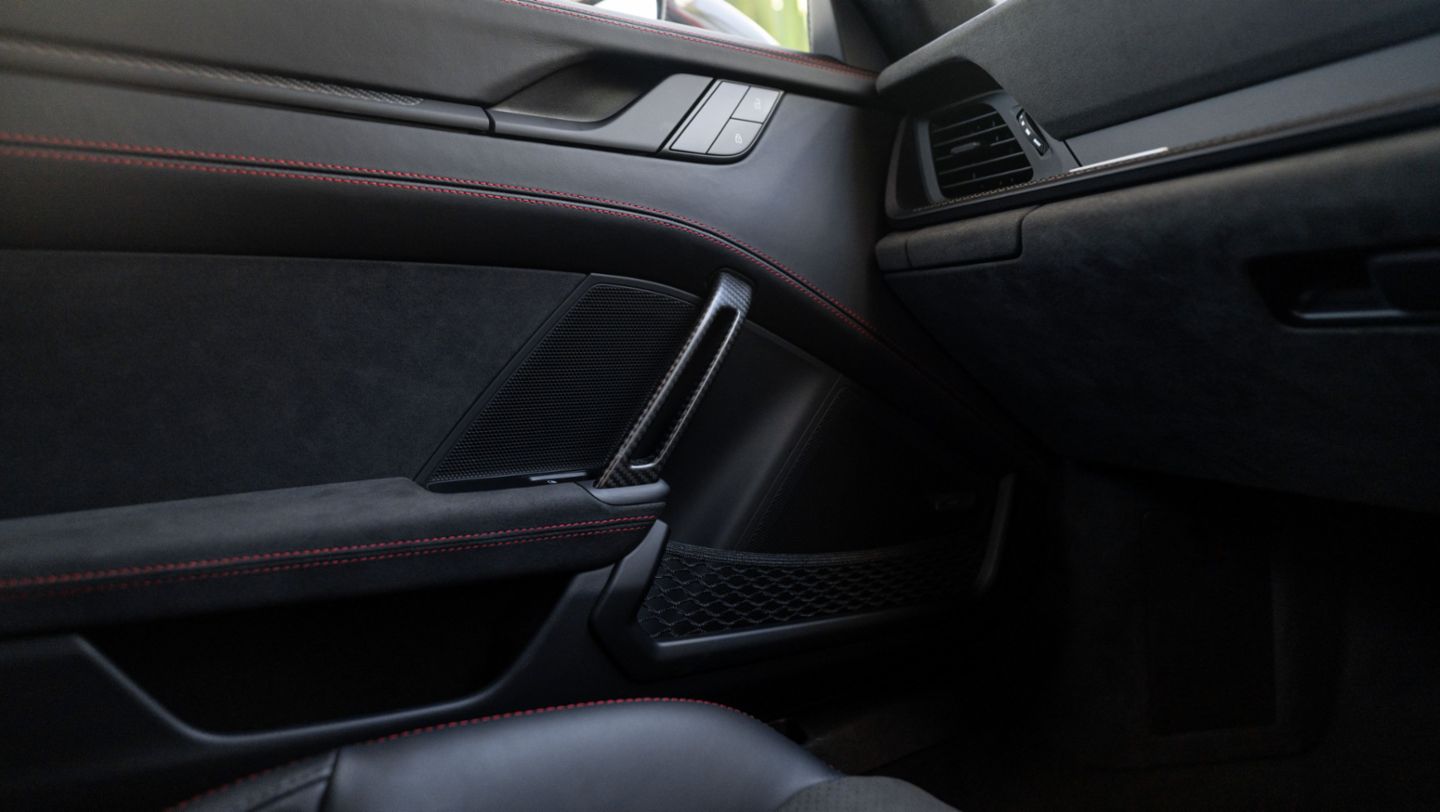 - Seats bolsters and headrests in Black leather with the seat centres partially in Black fabric