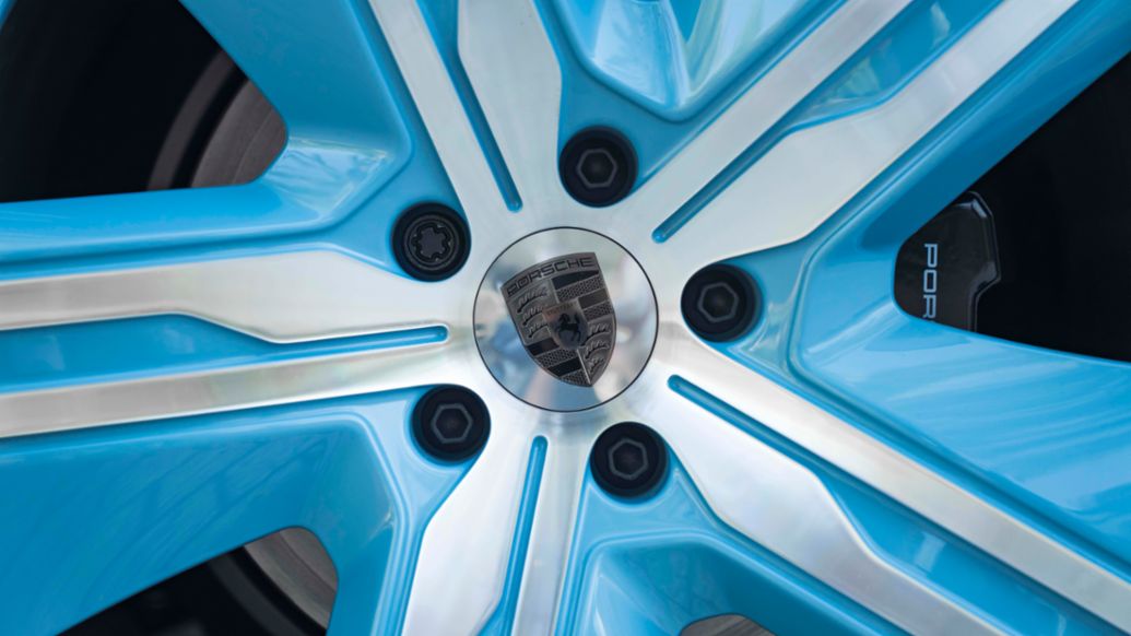 The 22-inch Macan exclusive design wheels, side blades, lower trim rear apron and exterior door mirrors are in matching colour against side windows trims in high gloss black and roof rails in black aluminium.