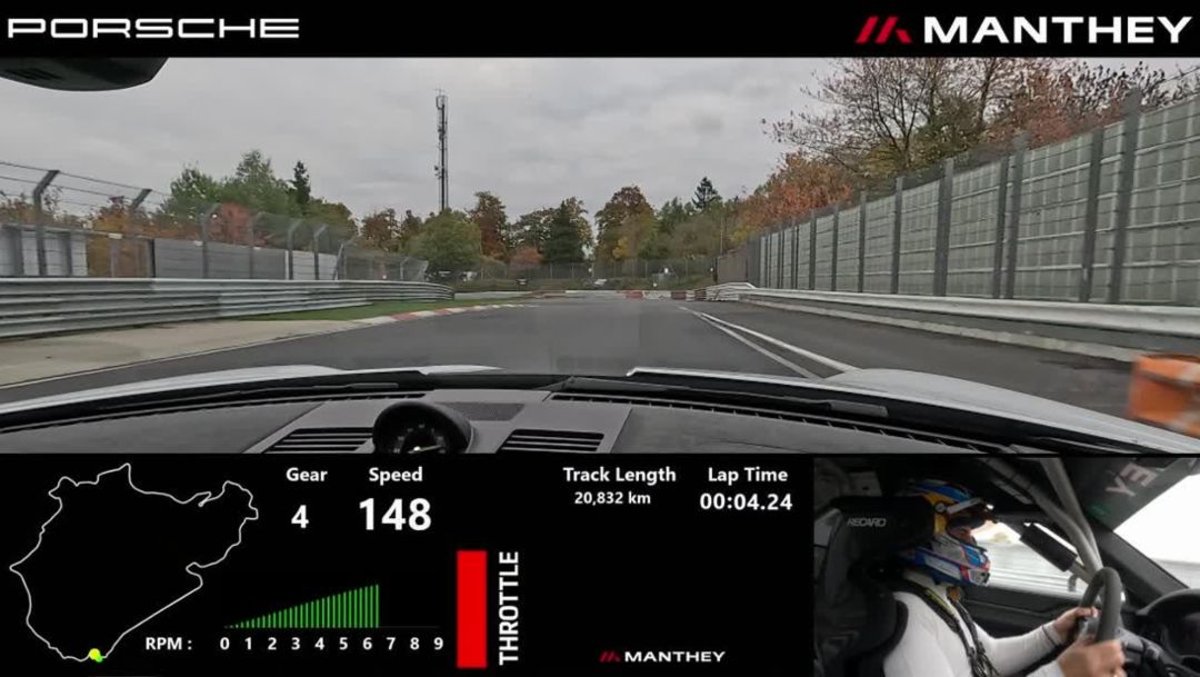 On the Nürburgring Nordschleife, which Porsche uses as a proving ground for sports car development, the 911 GT3 with Manthey Kit can play to its full strengths. With reigning DTM champion Ayhancan Güven at the wheel, and in less than ideal conditions, the modified GT sports car lapped the 12.9 mile circuit in the Eifel region in 6:52.981 minutes – 2.76 seconds faster than the previous generation (992.1) of the 911 GT3 with Manthey Kit. Both cars were equipped with the optionally available Michelin Pilot Sport Cup 2 R tires. The lap time was certified by a notary present on site.